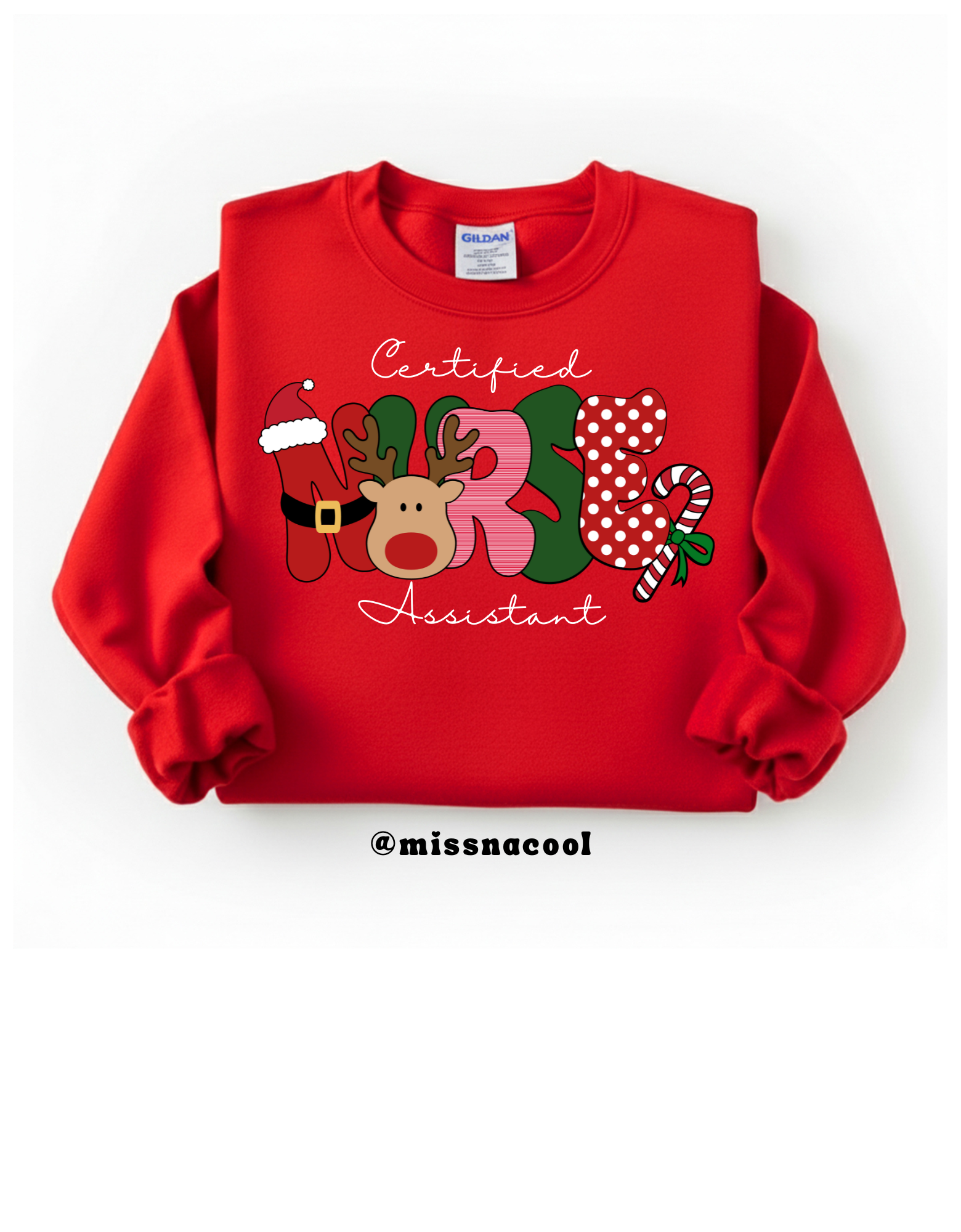 Celebrate the holidays in the cutest way with this Christmas “Nurse” Sweatshirt. Designed for nurses who bring care, comfort, and joy to every shift—even during the holiday hustle. This cozy crewneck features festive Christmas lettering with Santa hat, reindeer, and candy cane accents for the perfect seasonal touch.